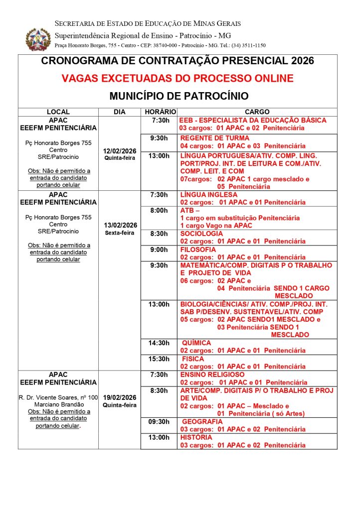 Cronograma de contratação presencial – EE de Ensino Fundamental e Médio EJA (Penitenciária) e APAC