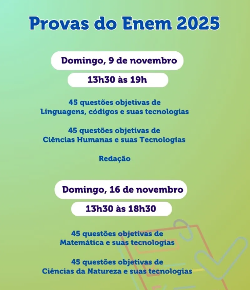 As provas do Enem 2025 estão confirmadas para os dias 9 e 16 de novembro. O exame mantém o formato tradicional de dois dias, com 45 questões de múltipla escolha em cada área do conhecimento e uma redação dissertativo-argumentativa.